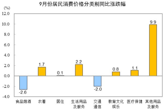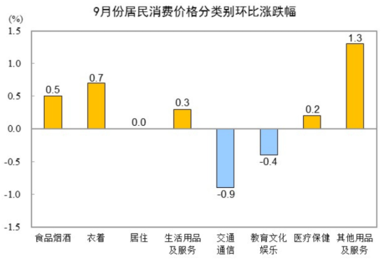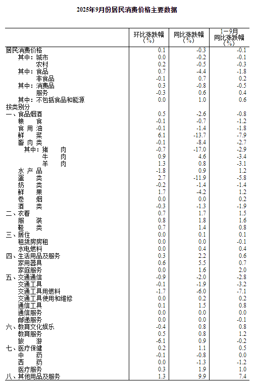 9月份,全国居民消费价格环比上涨0.1%。其中,城市持平,农村上涨0.2%;食品价格上涨0.7%,非食品价格下降0.1%;消费品价格上涨0.3%,服务价格下降0.3%。